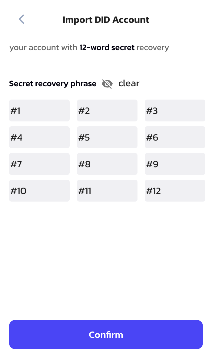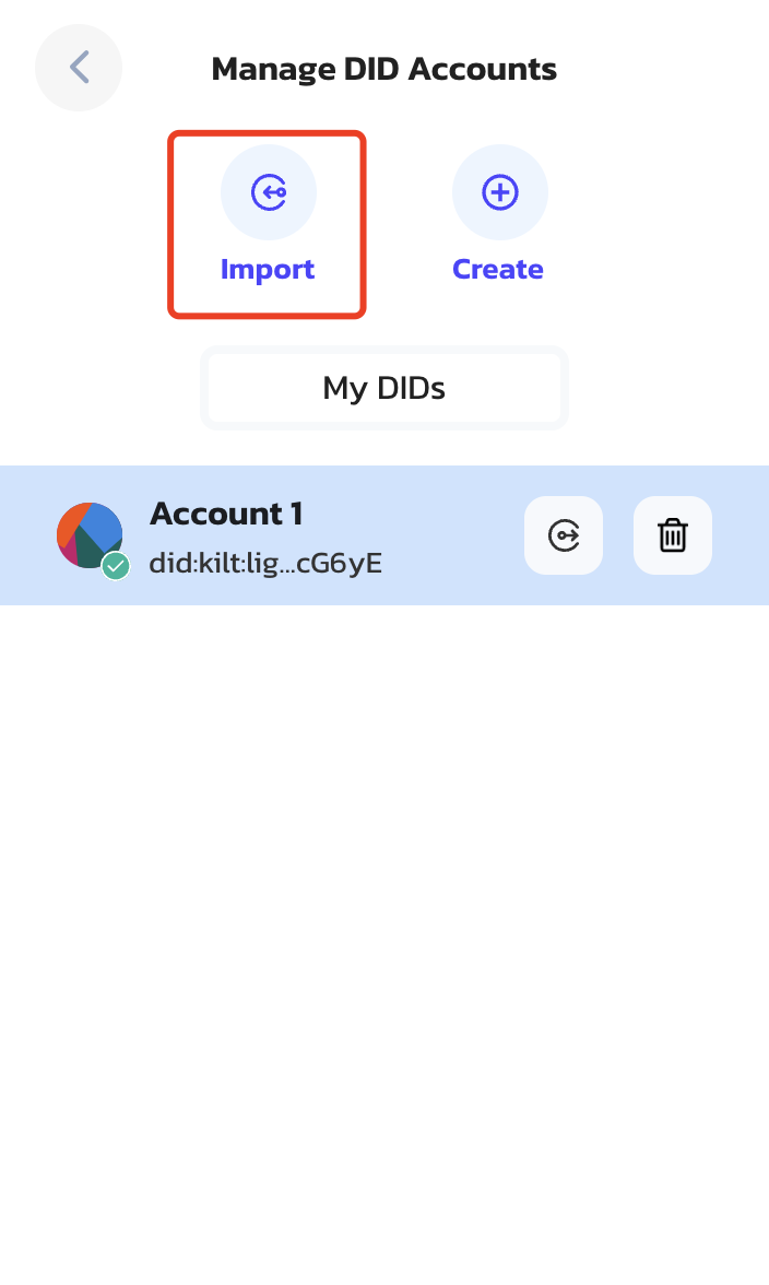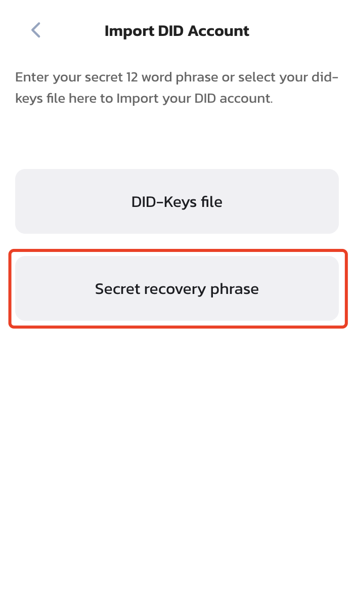 Once you log out, you should restore your account with DID-Keys File or Mnemonic Phrase at the 'Restore account' Page.