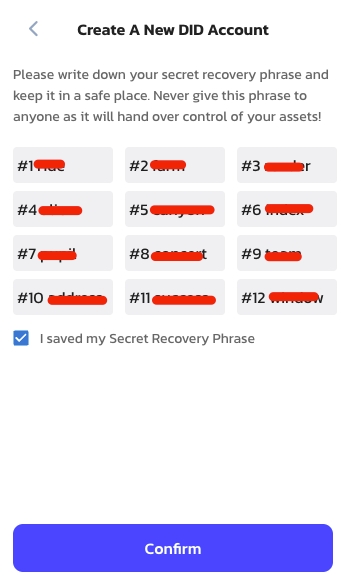 Once the account is created successfully, a DID-Keys File will be downloaded automatically. You should store the file, mnemonic phrases and password properly, for the reason that if they are leaked, the account may be at risk.